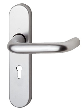 HOPPE 19mm safety lever on 194x40x10mm radiused backplate. This commercial backplate furniture is available in satin annodised aluminium. This lever set has a 19mm diameter lever.
