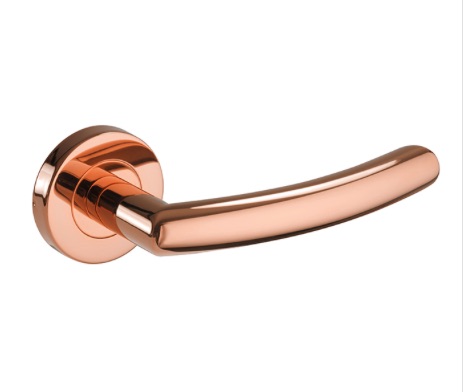 B16 series door lever handle on sprung round rose, manufactured by Access Hardware. A stylish and contemporary door handle. This handle combines sleek with contemporary, also available in a polished stainless steel, satin stainless steel, polished copper and matte black finishes. This lever exudes everything that is excepted of aesthetic excellence. These levers can also be used in wet areas and externally, but not coastal or chlorine areas.